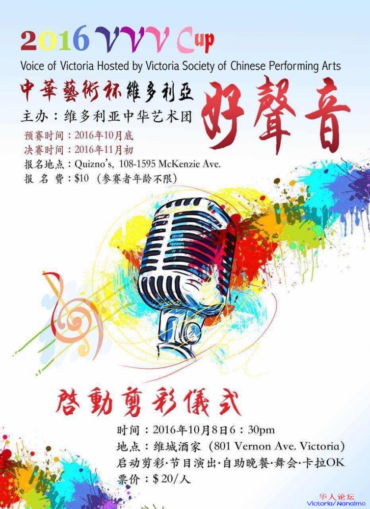 好声音,正式拉开序幕。本周六,将在维城酒家举行聚餐,剪彩,小型演出,期待每一个你的参与。活动报名,请参考下面海报,参加剪彩聚餐,可以联系微信: victoriachinese 250-885-5900