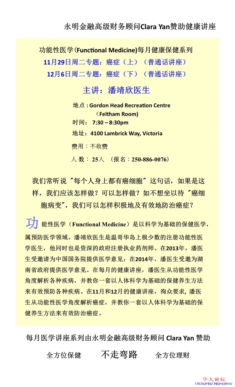 潘靖欣医生健康讲座主题癌症,分在11月29日(上)和12月6日(下)举行。有兴趣了解功能性医学如何防治癌症的朋友不要错过。在这两次讲座我也会简短介绍重大病保险是如何操作和理赔资料包括除外条款等。$ P: X9 ?& B) X% v" Z: R