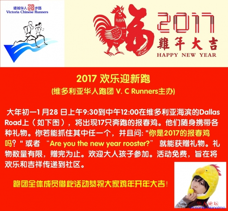6 n$ f& @1 y+ ~* B辞猴迎鸡,我们从活动筹备之初就得到了新春的祝福——维多利亚资深华人房产经纪Winnie Wu (2504809908)、Peterson 装修公司(7789225005)和维多利亚华人接待服务中心(微信pscc20150801)提供的赞助。本次活动完全免费,欢迎大家踊跃参加! 17位带着2017鸡年祝愿的报春鸡志愿者已经准备就绪,就等着你们来抓住他们,并说出鸡年的吉祥语:“你是2017的报春鸡吗?”一起来,追逐报春鸡,迎接新春到来吧!