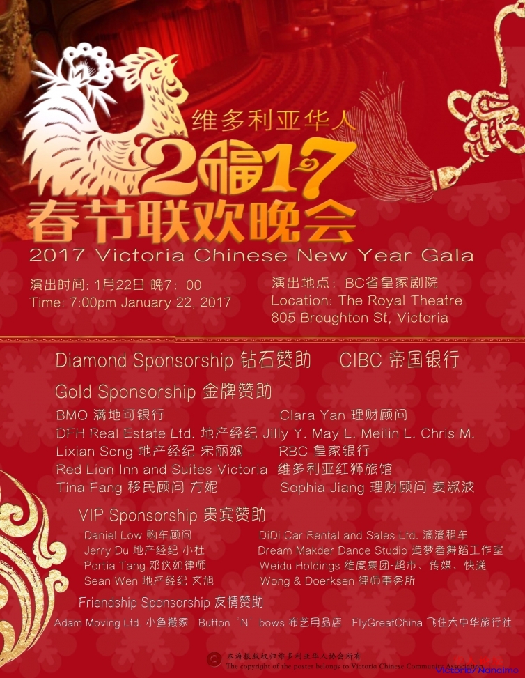 整台晚会的演出团体及个人,组委会成员,导演组成员,舞台工作人员均为志愿者,几个月不辞辛苦的组织与排练,奉献出维多利亚最盛大的一台晚会。大幕即将拉开,期待您的到来,让我们一起欢欢喜喜过大年!