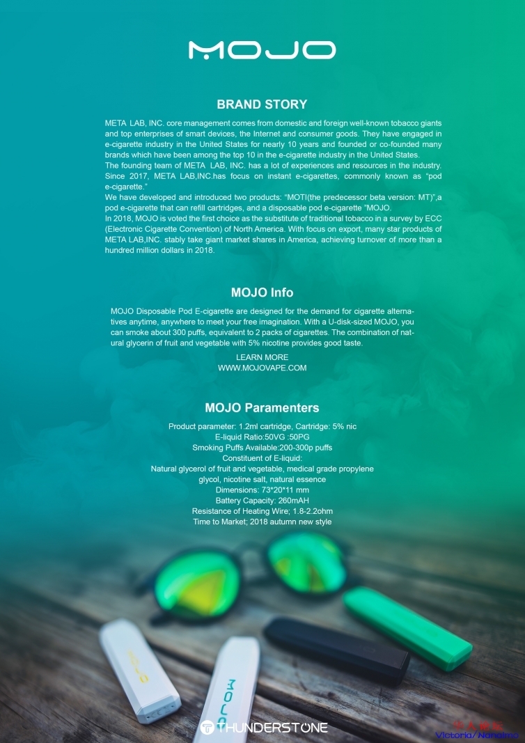 My name is Jason that work for META LAB, INC. & Thunderstone Technology Limited which is world’s top 5 wholesale shop. Now We have developed and introduced our two great products: “MOTI (the predecessor beta version: MT)”, a pod e-cigarette that can refill cartridges, and a dispensable pod e-cigarette” MOJO.
