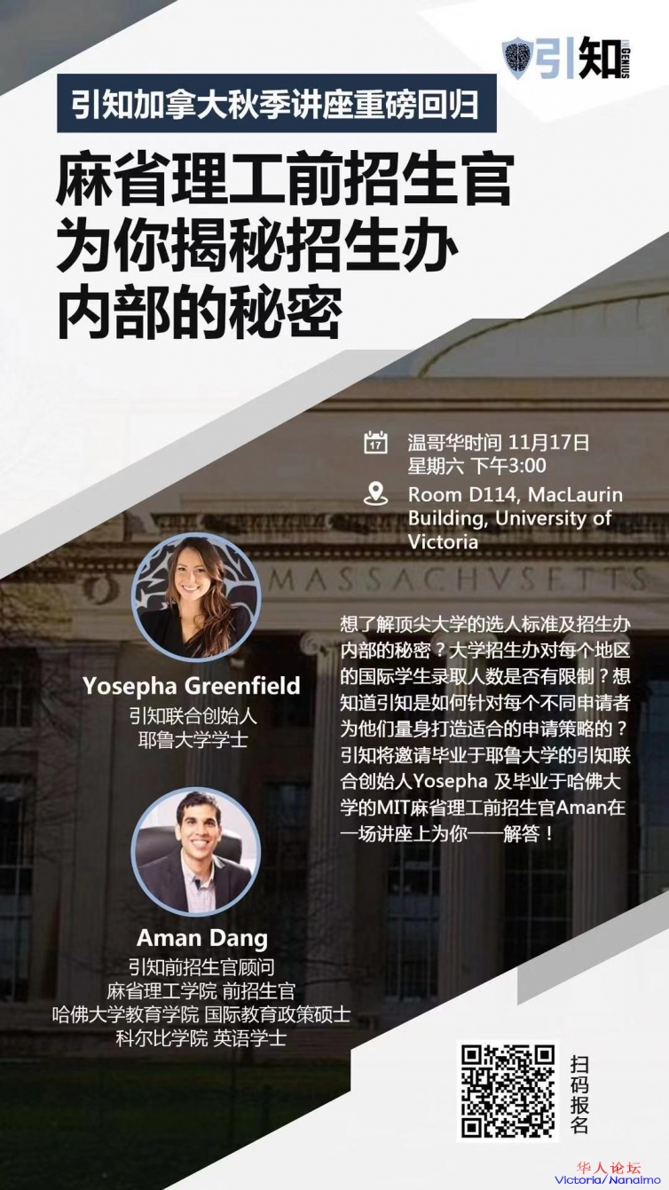 来自耶鲁大学的 Greenfield女士和来自哈佛大学教育学院的硕士,麻省理工的前招生官 Dang先生将于11月17日下午3点空降维多利亚大学教育学院,为大家讲解世界顶尖大学的招生标准和国际学生的申请策略(本科、研究生申请)。7 J, ^8 e# Y1 g# U/ d
