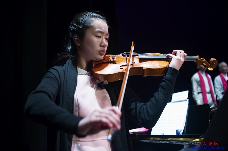 担任小提琴伴奏的隋娟(Clara Sui)小盆友,现为 Mt.Dong高中10年级挑战班学生。自九岁起学习小提琴,最近被选为2017年2月底LouisSherman弦乐协奏曲比赛决赛者之一。