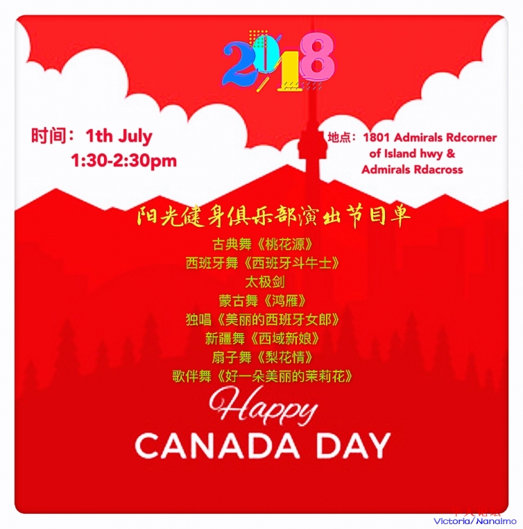 阳光健身俱乐部再次被邀请参加加拿大国庆日的文艺演出。届时我们将会带给观众们一台具有中华民族特色的表演。演出的地点:Craigflower Manor1801 Admirals Rdcorner of Island hwy & Admirals Rdacross the street from Canadian Tire ;演出时间:7月1号下午1:30。
