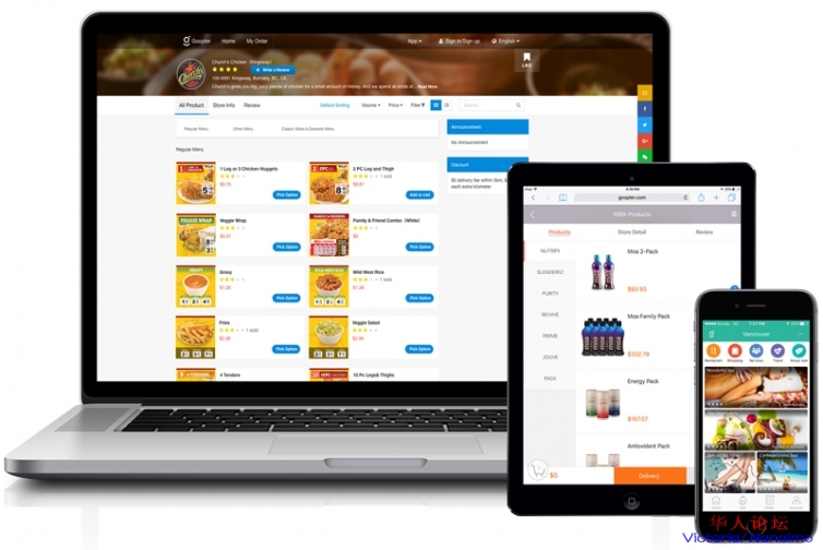 我们不仅提供多语言网站给消费者直接下单,而且提供商家后台管理的Web app 和手机app方便管理产品和订单。我们还有蓝牙打印机自动打印,邮件,手机提醒,短信等多种方法接收订单,保证您的订单能及时收到。同时,在我们的手机端app和微信平台上也会同步显示您的店。这样,可以帮助您满足不同客户的需求,让他们享受更好的订餐体验。